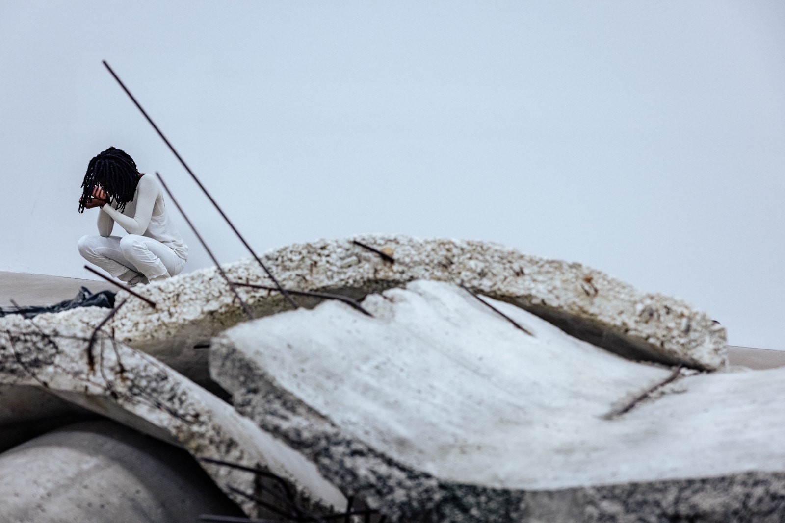 Image: Jonathan González with Marguerite Hemmings, Frequencies of Black Assembly and the Mythic, 2023. Performance with Anselm Kiefer’s The Women of the Revolution (Les Femmes de la Révolution), 1992/2013 at MASS MoCA in Magical Thinking, November 11, 2023. Photo: Ryan Harper.
