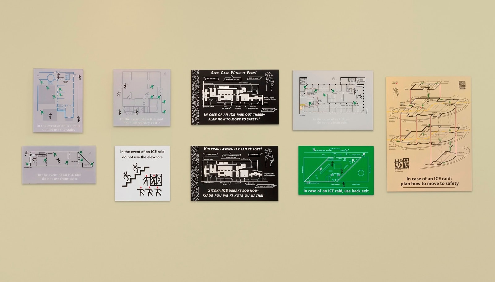 Jenny Polak makes site and community responsive art that reframes immigrant-citizen relations, amplifying demands for social justice. Originally from England, Polak’s family history of migration drives her to examine detention centers, racial profiling, and strategies for surviving hostile authorities. For the 2019/2020 academic year, Jenny Polak’s decentered public art project ICE Escape Signs, organized by the Tufts University Art Galleries and customized to Tufts University campuses, will be on view. This ongoing and evolving site-specific series is based on fire-escape signage and placed in buildings using their floor-plans. Drawing attention to the fact that people are living in daily fear of being caught in a raid by Immigration and Customs Enforcement, the signs both place those not living with undocumented status in the shoes of those that do and shares the often-obscured reality of the undocumented lived experience. Originally conceived during the George W. Bush administration, when the Homeland Security Act led to the establishment of the Bureau of Immigration and Customs Enforcement now known as ICE, the project gains new relevance in the debates of the present. Polak worked directly with students at Tufts University to conceptualize this iteration, dialoguing about the overlapping realities of living undocumented or experiencing it through family members and communities, the potentialities and drawbacks of sanctuary city mandates, support systems available through the university, and evolving federal policies. What emerged is a complex terrain of navigation through anxiety and life-affirming community, and this signage opens a dialogue about what is necessarily hidden from public view.